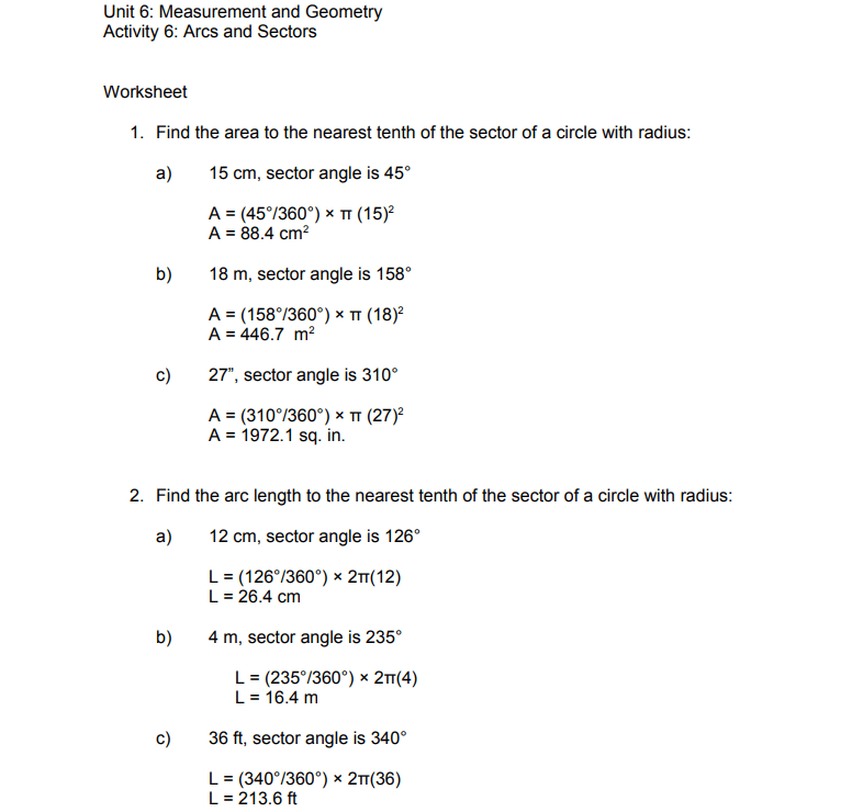 One complete revolution of a circle equals 2π radians which are equivalent to 360° in degrees. FInd the slope, midpoint, and distance of line segments. Awaiting you are a number of pdf materials with solved examples on a multitude of topics like. Radians is an si unit to measure angles. Formula, derivation, calculate the area, area using diameter and circumference at … Arc length and area of a sector worksheets. Of a circle, as well as the area of a sector of a circle and the length of an arc of a circle. Each chapter builds on the skills reviewed in the chapters that precede it. Our punctiliously curated, printable worksheets are here! This page includes measurement worksheets for length, area, angles, volume, capacity, mass, time and temperature in metric, u.s. A comprehensive and coherent set of mathematics standards for each and every student from prekindergarten through grade 12, principles and standards is the first set of rigorous, college and career readiness standards for the 21st century. Notebook 2 may 14, 2014 mar 249:56 pm example: Hence, 2π radians = 360° which implies 1 radian = (180°/π) degrees.